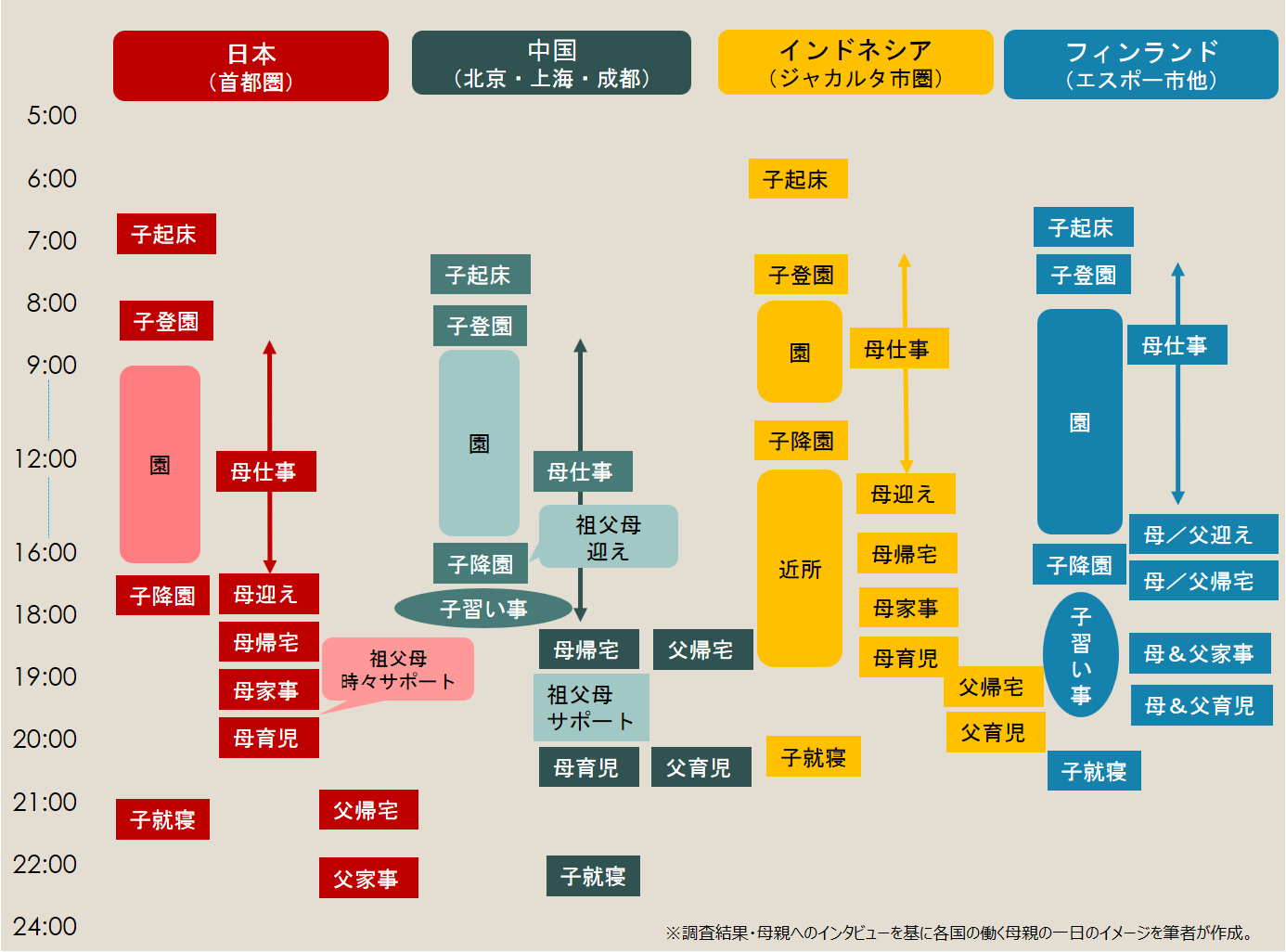 図1は、本調査結果や、調査の前に各国を訪問して行った母親へのインタビューを基に、各国の都市部の共働き家庭の一日のイメージを筆者がまとめたものである。全体像をつかみやすくするため、平均値から作成したイメージ図であり、個々の家庭の差は図示していない。有職の母親が仕事を終えてからの生活の流れに着目しながら、データと共に見ていきたい。尚、この後、出てくる父親のデータは、共働きの母親が、配偶者について回答した結果である。