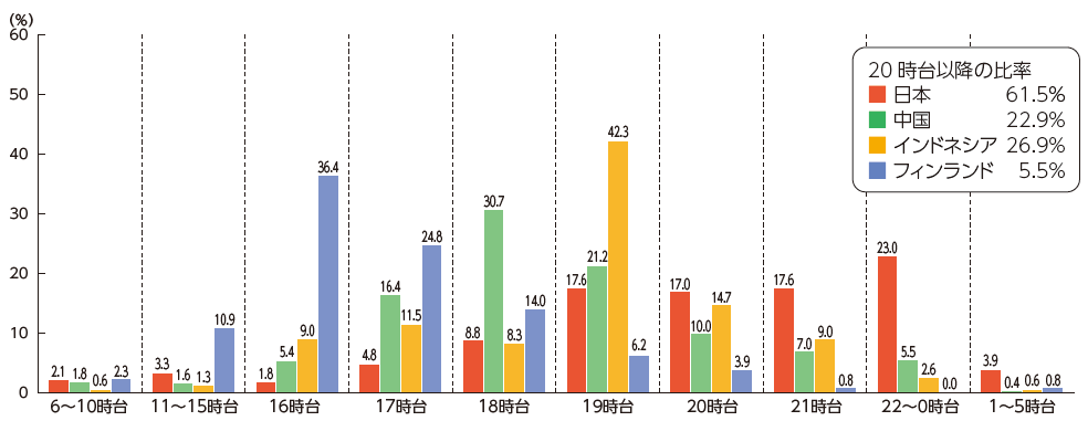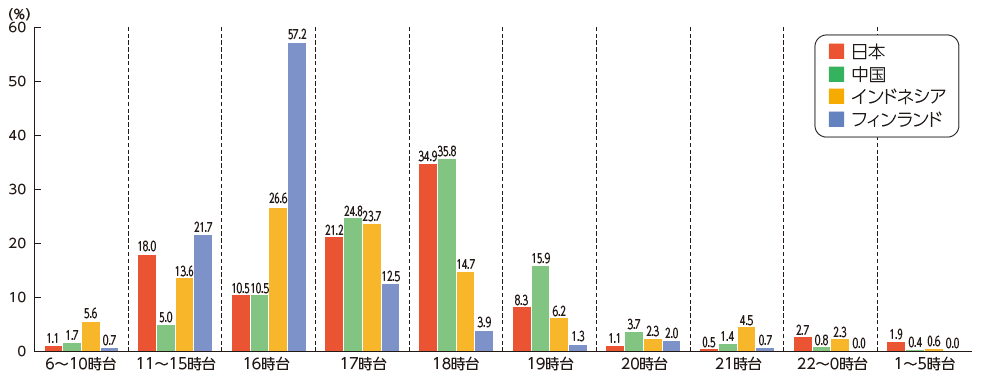 母親の帰宅時間が遅いのは、中国と日本(図2)。日本の場合は、常勤者とパートタイムで差はあるが、帰宅時間のピークは18時台。常勤者の多い中国も、18時台がピークである。一方、インドネシアとフィンランドは帰宅時間のピークは16時台と早い。