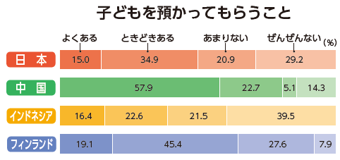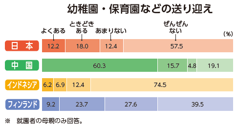帰宅後の家事・育児について、祖父母世代の強力なサポートを得ているのは中国(北京・上海・成都)の働く母親である。祖母との同居率も5割を超えている。日本と同様、働く母親の帰宅時間は「18時台」と遅めであるが、幼児園(中国の幼稚園)が閉園する時間はもっと早いため、祖父母が園への送迎を行う比率は、「よくある」が約6割である(図5)。「子どもの預かり」、「家事」についても、「よくある」比率は6割前後と、他の3か国と比べて顕著に高い。本調査を監修した国立教育政策研究所の一見真理子総括研究官は、中国の女性の定年は55歳かそれ以前と早く、まだ若くて元気な祖母世代が孫の育児を担い、それが祖母自身の第二の人生の喜びにもなっていると指摘している。