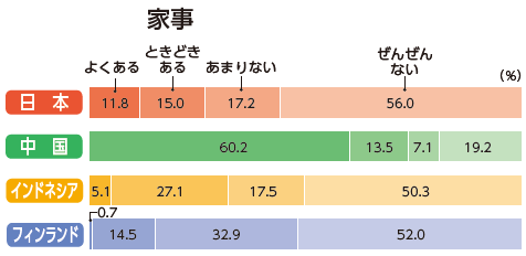 子どもの就寝時間は、ピークの時間帯でみると、インドネシア(20時頃)とフィンランド(20時半頃)が早く、日本(21時頃)、中国(21時半頃・22時頃)が遅い(図表省略)。帰宅後、子どもが寝るまでの約4時間、有職の母親は家事・育児を誰とどのように行っているのだろうか。各国ごとに特徴をみていきたい。