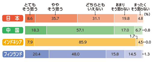 本調査では、母親に対して、育児、家事、仕事、そして、仕事と家庭生活のバランス、生活全般について、それぞれ5段階で満足している程度をたずねた。図6は、そのうち、「仕事と家庭生活のバランスに満足している」結果である。「とてもそう思う」、「ややそう思う」を合わせると、日本の母親のみ44.3%と半数を割っており、中国(75.4%)、インドネシア(93.8%)、フィンランド(68.4%)と比べて顕著に低い。日本の母親の満足度が低い傾向は、育児、家事、仕事、生活全般についても同様である(図表省略)。
