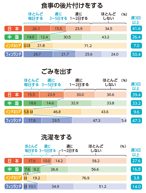 日本の共働きの父親は「帰宅時間が遅くても取り組める」家事に取り組む頻度がフィンランドについで高い