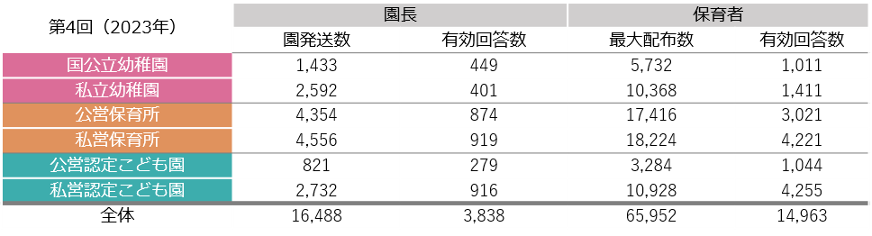本調査は、園長を対象とした調査と保育者を対象とした調査からなります。園長を対象とした調査は、全国規模で、園の種別を超えて実態や課題を把握し、過去との比較も可能な枠組みになっています。さらに、今回の第4回(2023年)調査では、幼稚園・保育所・認定こども園の保育者も対象に追加し、子どもや保護者に向き合っている保育者の声を拾いあげることで、保育実践と保育者の育成の現状と課題をとらえることを試みました。