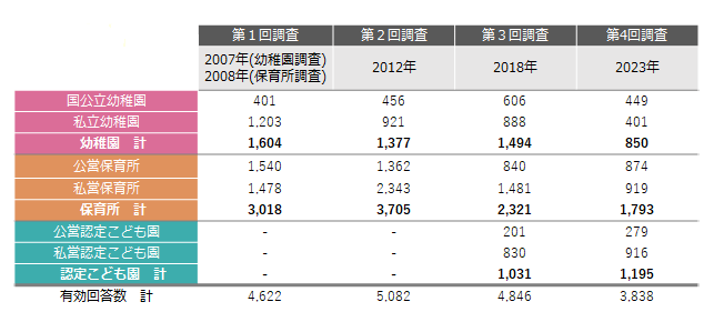 少子化の進行や乳幼児がいる家庭の共働きの増加など、社会の状況は変化しています。前回(2018年)の調査以降、幼児教育・保育の無償化の導入、幼保小の架け橋プログラムの推進、こども家庭庁の創設、こども基本法の施行など、園をとりまく環境は変化しています。このような変化の実態を明らかにするために、幼稚園・保育所・認定こども園の園長先生・保育者のみなさまにご協力いただき、園の実態・課題を調査しました。