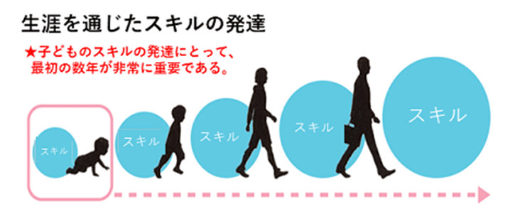 同レポートでは、社会情動的スキルの特徴として、社会情動的スキルが生涯を通じて伸ばすことができる力であることが挙げられています。ただ、「スキルはスキルを生む」と言われ、人生の早い時期に身につけることで、その後に得られるスキルが大きくなっていくと言われています(図1)。