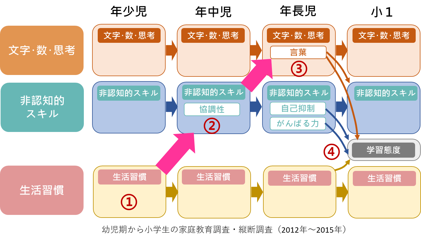 この調査の結果、この3つの力には順序性があることが明らかになりました。年少児の生活習慣が年中児の社会情動的スキル(協調性)につながり、それが年長児の文字・数・思考(言葉の力)を育て、その文字・数・思考と社会情動的スキルが、小学校以降の主体的な学習態度を育てていく関係性が見えてきました。幼児期にふさわしい体験を通して社会情動的スキルや認知的スキルを身につけることが、小学校以降の学びに求められる態度を育てていくことが分かりました。