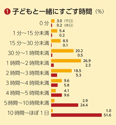 ベネッセ教育総合研究所で小さな子ども(0歳~6歳)を持つ父親に調査を行ったところ、出産に立ち合う父親は約半数を占め、育児や家事に取り組む割合も少しずつ増えており、家族を大事にしようとしている様子がうかがえました。しかし、先進国の中では、日本の父親が家事・育児に費やす時間は少ないほうです。日本のお父さんは、平日の仕事が忙しく、小さな子どもが就寝するであろう21時以降に帰宅する割合が約4割を占めています。子どもとかかわりたいと思っても難しい状況にありますが、仕事に追われて帰宅が遅くなる平日の分を休日に埋め合わせしようとするかのように休日は「10時間~ほぼ一日」子どもと一緒にすごしているという人が半数を超えています(図①)。このように忙しい中でも、もっと子どもや家事にかかわりたいと思っている父親は54%を占めています。