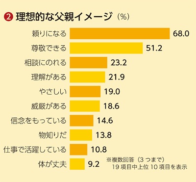 仕事に子育てに涙ぐましい努力をしている日本の父親ですが、父親自身が抱く理想の父親像とは、一体どのようなものでしょうか(図②)「頼りになる」「尊敬できる」「相談にのれる」「理解がある」父親であることが上位にきています。子どもから尊敬され、頼られ、ときには子どもの相談にものるといった、たくましさと優しさを併せ持った存在が父親にとっての理想の姿だといえるでしょう。