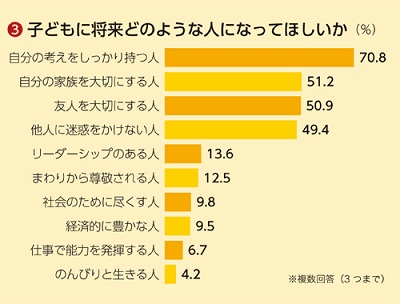 また、子どもに「将来どのような人になってほしいか」という質問では、「自分の考えをしっかり持つ人」「自分の家族を大切にする人」「友人を大切にする人」「他人に迷惑をかけない人」が上位にあがりました(図③)。ここからは、変化の激しい社会の中で流されずに自分の考えをしっかりと持ってほしい、また周囲の家族や仲間を大切にして生きていってほしいという父親の思いがうかがえます。
