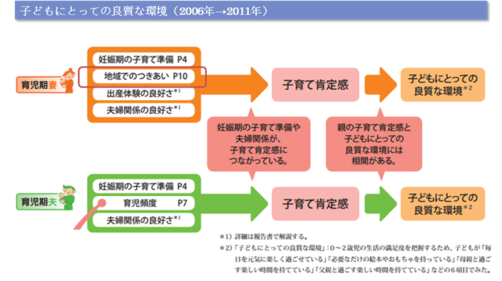 子どもにとっての良質な環境には、「子育て肯定感」が影響。「地域でのつきあい」などが、肯定感を高める要因。