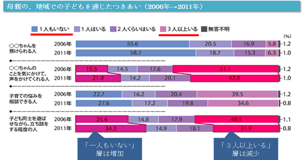 同調査ではほかに、子育て支援の環境が整備されてきていて、制度は充実してきていることを明らかにするデータもありますが、地域での人とのつながりについては少なくなってきているといえそうです。