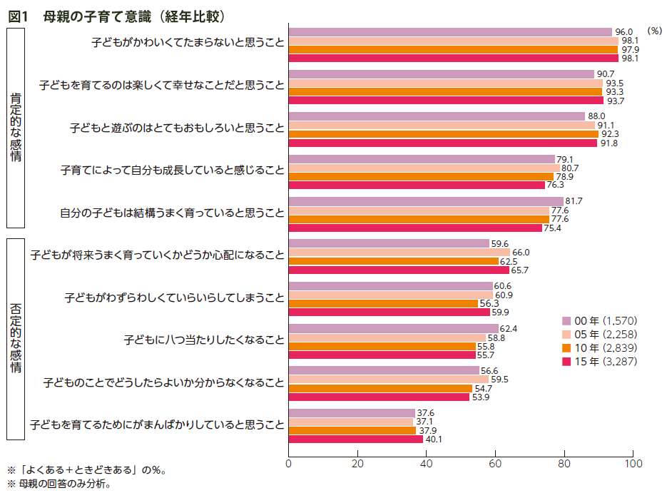 本調査には子育てへの感情をたずねる設問があります。「子どもがかわいくてたまらないと思うこと」など、肯定的な感情を示す項目について「よくある+ときどきある」と回答する比率は約8~10割と高く、15年前から大きな変化は見られません(図1)。幼児の生活を取り巻く環境が時代とともに変化していることとは対照的に、最も変化の少なかった項目でもあります。これは、子育ての喜びや楽しさが時代によっても変わりにくい本質的な価値であり、多くの幼児の保護者が前向きに子育てに取り組んでいることを示していると考えられます。