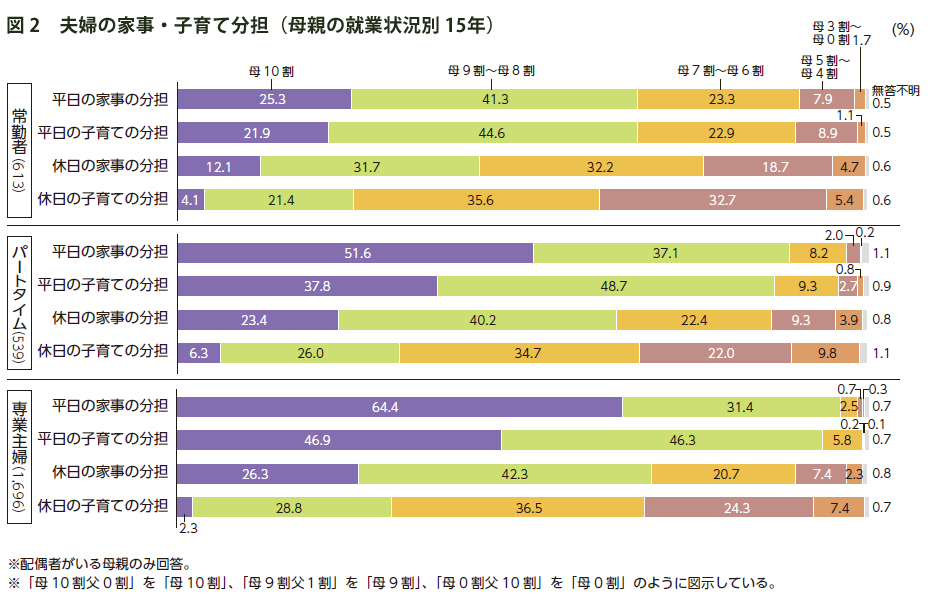 このことと関連して、本調査では、家庭内での家事・子育てについて母親と父親の分担の割合をたずねています。休日には父親の分担が増えるとはいえ、平日の家事や子育ては、専業主婦の9割以上、常勤の母親でも約7割が「自分が8割以上担っている」と回答しています(図2)。