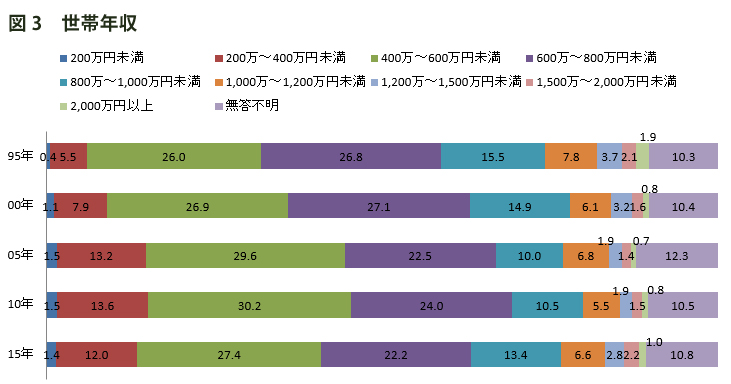 本調査では幼児の保護者に世帯年収をたずねています。1995年に実施した第1回の調査では、400万円未満の比率は5.9%でしたが、2015年の調査では13.4%に増加しました(図3)。