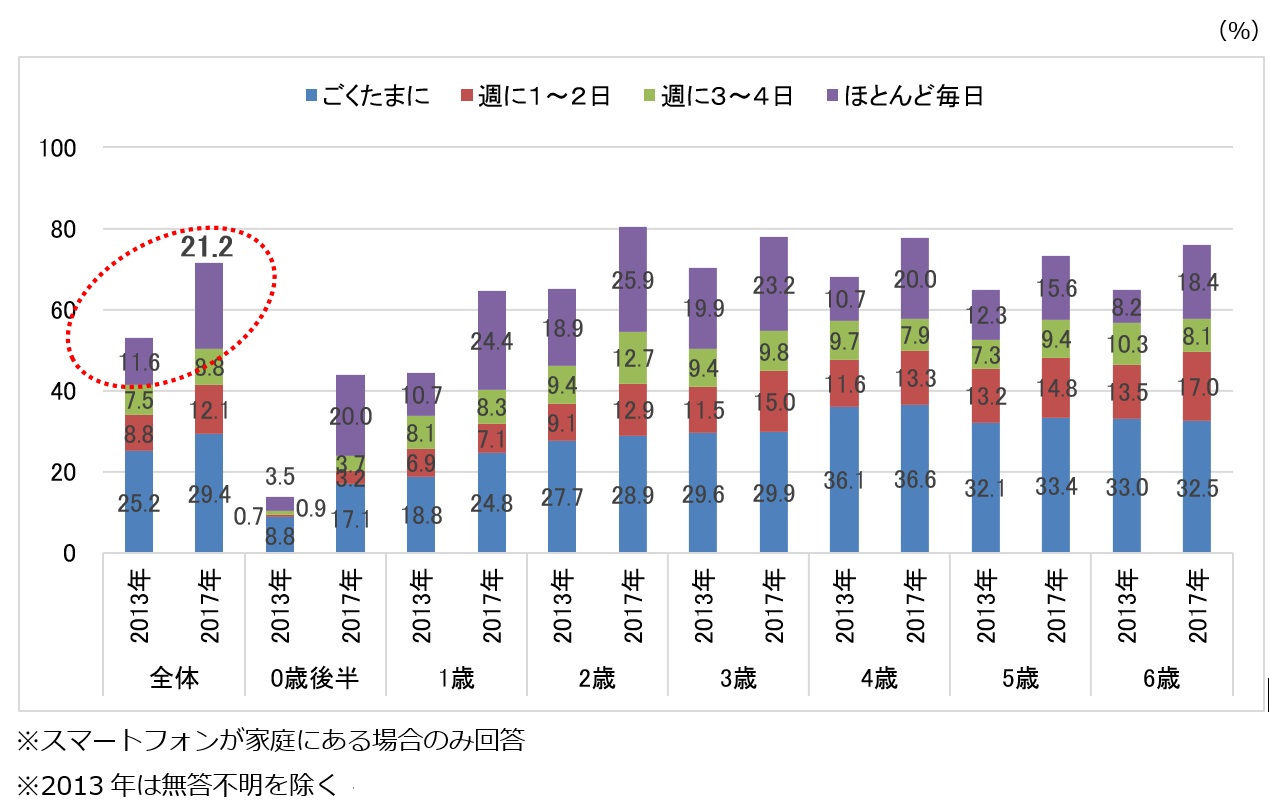 スマホの接触頻度、乳幼児の約2割が「ほとんど毎日」