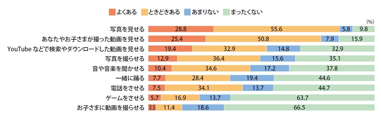 次に、スマートフォンやタブレット端末などでどのようなことをさせているのかを示したのが下の【図3】です。多い順に、「写真を見せる」(「よくある」「ときどきある」の合計で84.4%)、「あなたやお子さまが撮った動画を見せる」(同76.2%)、となっています。全体的に、「写真を見せる」「動画を見せる」「写真を撮らせる」「一緒に踊る」といった、親子一緒での使用が想定される場面が多く、「ゲームをさせる」といった一人で使用させる場面は多くないことがわかります。