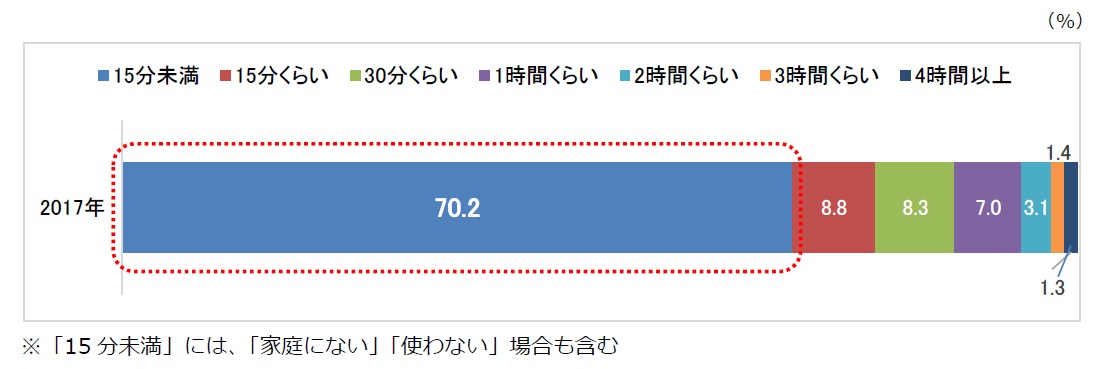 【図1】で示したデータだけを見ると、乳幼児のスマホ利用が由々しき事態であるかのような印象を持つかもしれませんが、そこは冷静に捉える必要がありそうです。下の【図2】は、乳幼児の平日1日あたりのスマートフォン接触時間を示しています。約7割は1日の接触時間が15分未満に留まっていることがわかります。