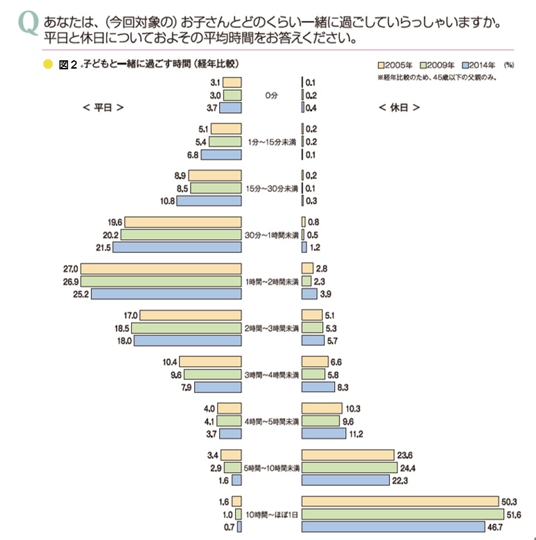 こうした状況を受けてか、父親が平日、子どもと一緒に過ごす時間は「1時間~2時間未満」がもっとも多く(25.2%)、2番目に多いのが「30分~1時間未満」(21.5%)という結果でした(図2)。一方、平日に子どもと触れ合う時間が十分でない分、休日に集中して一緒に過ごすようにしている様子がうかがえます。この傾向も2005年ごろから変わっていません。