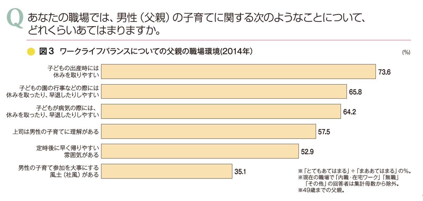 ワークライフバランスの実現には、育休やフレックスタイム制など、職場における諸制度の充実が欠かせませんが、それらの実効を上げるための、子育てへの理解や風土といった質的な要素も重要です。下の図3は、育児に関する職場の雰囲気を父親に尋ねた結果で、もっとも「あてはまる」比率が高いのは「子どもの出産時には休みを取りやすい」(73.6%)でした。一方、「男性の子育て参加を大事にする風土(社風)がある」は35.1%にとどまりました。ある程度、予定や見込みを立てられる出産や行事への参加に加えて、子どもの突発的な病気などに対する職場の理解は広がっているものの、職場や会社全体の雰囲気や風土といったものはなかなか広がらないようです。