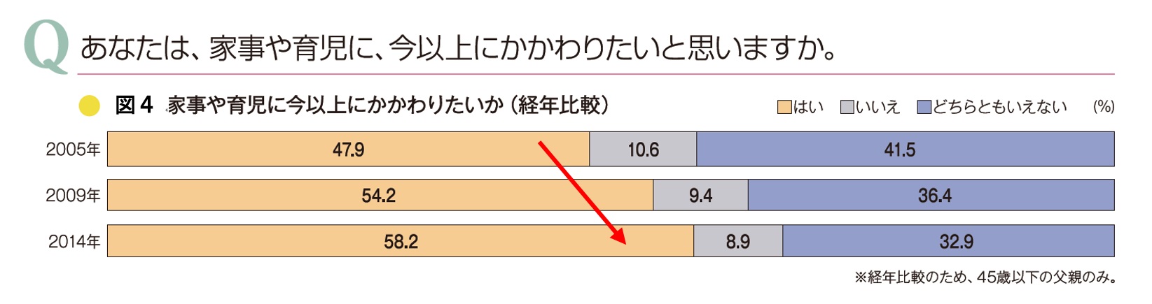 上の図4からわかるように、家事・育児に今まで以上に関わりたいと思っている父親は全体の約6割います。「関わりたくない」比率は8.9%、「どちらともいえない」は32.9%です。経年でみると、2005年からの9年間で「関わりたい」と思う父親は増加しています。
