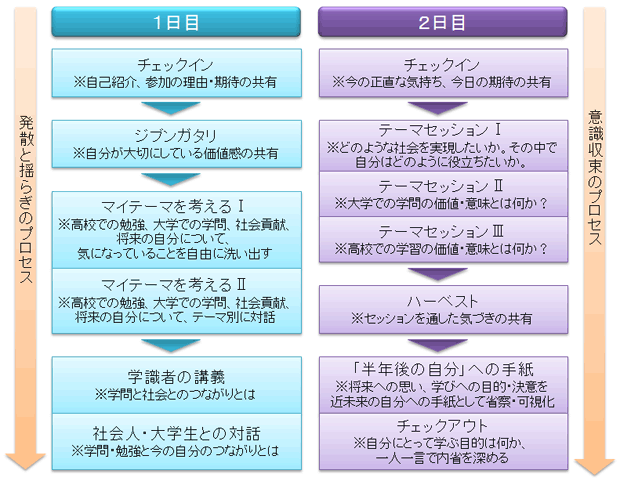 前半は、自己の関心を持っていること、社会問題とその解決方法、学問と社会のつながり等をテーマとしたセッションを、生徒だけでなく大学生や社会人、学識者なども加わりながら繰り返します。多様な視点から各自思い切り思考を「発散」させ、それまでの価値意識に揺らぎを与える段階です。後半は「収束」段階です。「では、将来社会で生きていく上で自分が本当に大事にしたいこと(マイテーマ)は何か」という問題意識を踏まえつつ「自分が学ぶ目的は一体何なのか」という観点から自己の思いを語り合い、最終的に文章にして内省化を促します。この時、マイテーマや学ぶ目的は「仮決めでよく、今後いくらでも変わっても良いもの」とします。決定の心理的ハードルを下げるためでもあるし、実際、個人の将来の課題は変化していくものだからです。まず決めることが大事、という立場です。