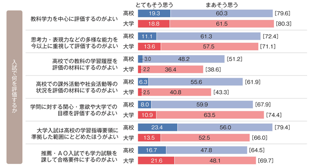 本調査で、入学者選抜で評価する内容についてたずねたところ、高校・大学ともに「教科学力を中心に評価するのがよい」が8割の支持で最も高く、「思考力・表現力などの今以上の重視」や「学問に対する関心・意欲や大学での目標」の評価もいずれも7割前後の肯定率であった(図1)。「高校での学習履歴」や「高校での課外活動や社会活動等の状況」の評価は大学では肯定率が4割前後にとどまるものの、高校では半数を超えている。教科学力以外の能力も評価していくという方向性については支持が得られていると言えよう。ただし、そのバランスをどう考えどのように評価していくかは今後の重要な論点である。
