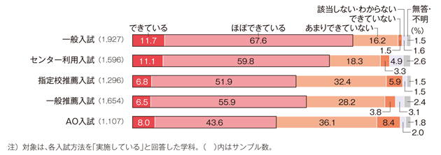 今回の調査で、大学に対して入試方法別に「入学させたい学生が選抜できていますか」とたずねた結果においても、AO入試と指定校推薦入試は、それぞれ当該入試方法の実施学科のうち44.5%、38.3%が「できていない」(あまりできていない+できていない)と回答している(図2)。こうした状況がみられる中で、AO入試型の選抜方法のさらなる拡大を行うことに危うさはないのだろうか。同部会では、「一般入試・推薦入試・AO入試の区分を見直し、入学者選抜全体において、多面的・総合的に評価する総合型選抜へ」の転換が検討されている。今一度これまでの推薦・AO入試の課題を丁寧に総括した上で、今回の改革でそれがどう改善されるのかを具体的に示し、関係者の理解を促すことが必要だろう。