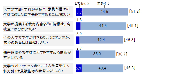 志願者の「関心・意欲」を評価するためには、高校生がその大学に入学したらどのようなことが学べるのかを知ることができることが前提である。調査結果では、高校の約半数が「大学が提供する教育内容などの情報は、高校生には分かりづらい」としており、同じく半数が、現在入手できる情報をもとに、教員が進学先をすすめることの難しさも感じている(図4)。また、アドミッションポリシーについても5割弱の高校で、「受験指導の参考になりにくい」と感じている。オープンキャンパスや出張講義などの取り組みは広がってきたものの大学情報の提供は充分とは言えないようだ。