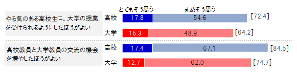 さらに、今後のあり方についてたずねたところ、「やる気のある高校生に、大学の授業を受けられるようにしたほうがよい」は高校で72.4%、大学で64.2%が肯定し、また、「高校教員と大学教員の交流の機会を増やしたほうがよい」も高校84.5%、大学74.7%と高い肯定率である(図5)。このような高大連携の取り組みを充実させるための仕組みづくりや、国において現在準備が進められている「大学ポートレート」*1の稼働も待たれる。高校生が直接大学の教育に触れる機会や、大学と高校の教員同士が直接意見交換を行うなど、入試改革とともに高校生の主体的な進路選択を可能とする環境の整備は欠かせない。