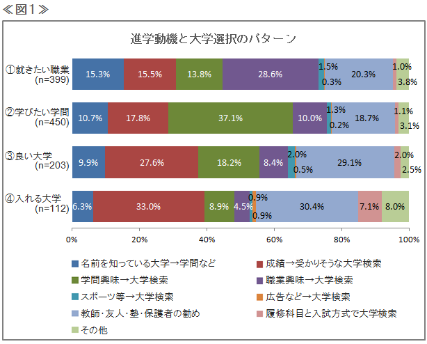 図1は、進学動機と大学選択のパターンをクロス集計したものである。同じデータは、上に述べたView 21 大学版にも掲載している。ここでいう進学動機は、以下の4つのパターンに分けている。