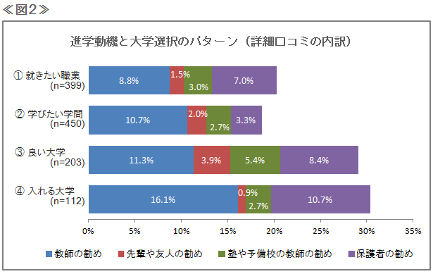 図2は、「教師・友人・保護者の勧め」を更に詳しく見た内訳である。帯グラフ中のパーセンテージは、全体の中での割合を示している。(たとえば図1の①の「教師・友人・保護者の勧め」20.3%中、教師の勧めは8.8%が占める、というように細かい内訳が示されている。)