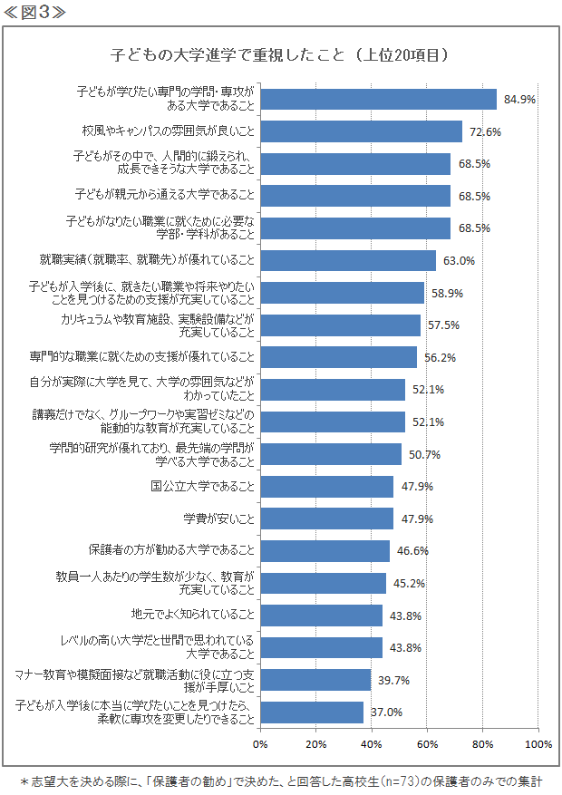 それでは、「保護者の勧めで志望校を決めた」という高校生(全体で73名)の保護者は、子どもの大学進学の際に何を重視しているのだろうか。特にこのセグメントの保護者が重視したことは何なのかを見ると、どのようなアドバイスをしているか、大学は保護者に何を伝えるべきなのかのヒントとなるだろう。図3は、その重視した項目(とても+まあ重視したの合計)上位20項目を抽出したものである。