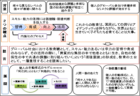 以上を踏まえ、グローバル社会に必要な教育観として、スキル・能力あるいは学力の習得や育成のみならず、それを活用するに際して「異質的な集団の中で他者とともに生き、自他の関係性の中で共通の課題に取り組んでいく」という「価値意識」の形成を教育の土台とすることを提案したい。当然ながら、これまで、文部科学省は国際理解教育の推進に努力し、学習指導要領においても明示してきた。今後、こうした教育の理念を一人ひとりの学校の先生と親をはじめ、地域コミュニティ、社会の全体に定着した一つの教育観として、一層取り上げることが重要である。