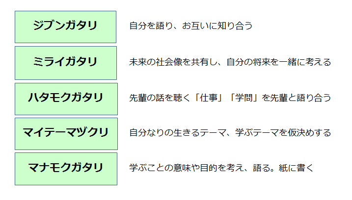 ワークショップ中盤では、実施校を卒業して数年の若い先輩方を招き、生徒が4人程度ずつ座る小さな輪に1-2人ずつ入っていただく。双方の自己紹介後に、「働く目的」「高校時代に勉強しておくことの意味」「大学生活の様子」について、意見交換を行う。そののち、ファシリテーターは全体に対して問いを投げかける。例えば「少子化という課題を、あなたならどう解決しますか」など。そこで、大学生や社会人は自分の学問や職業の専門性を通し、課題を解決しようとし、悩みながらも思考し発言する。学びと社会のつながりを考えている同じ学校の先輩の身近な姿を通して、高校生達は深く感じ取るものがあるという。数年後の自分達に近しい先輩と一緒に悩み、共感することによって、大学に入学した後の成長した先輩の姿を同一化し、学ぶ意味を理解するのである。アンケートでも「印象に残ったプログラム」第一位はこの「ハタモクガタリ」である。