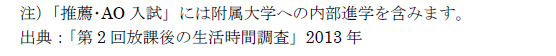当研究所で2013年11月中旬に実施した調査(「第2回放課後の生活時間調査」)から、高校生の希望する入試形態と進学先の決定状況別に11月の学習時間を比較したものが図1である。11月中旬は、推薦・AO入試受験者でも進学先が決定している人とそうでない人に分かれる。結果をみると、宿題以外の勉強時間について、「一般入試受験希望者」>「推薦・AO入試受験希望かつ進路未決定者」>「推薦・AO入試受験者かつ進路決定者」の順に長くなっている。推薦・AO入試希望者であっても進学先が決まっていない人はそこそこ勉強しているが、進路が決定した人の学習時間は明らかに少ない。