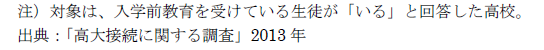 これらのデータからみえるのは、受験が学びのインセンティブになっているが、それが終わると学ぶ目的が薄れ、自主的な学習時間は減ってしまうこと、そして、高校としては、残る生徒の受験指導が続くので試験によって学習を継続させようとしているが、大学が提供する入学前教育などによって先に目を向けた学習をすることも有効だと考えているということだろう。