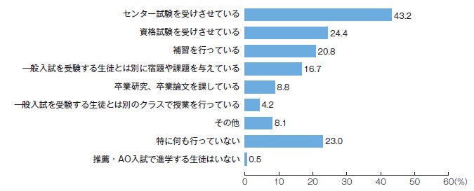 そのような状況に対して、高校側はどうしているのか。「高大接続に関する調査」(2013年実施)の結果では、推薦・AO入試で早期に進学先が決まった3年生の学力を保証するために、何らかの取り組みを行っている高校が約4分の3にのぼる(図2。「特に何も行っていない」「推薦・AO入試で進学する生徒はいない」以外の割合)。なかでも「センター試験を受けさせている」高校は4割を超えている。
