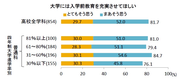 また、大学に対しても「大学には入学前教育を充実させてほしい」と考える高校が8割に達し、四年制大学進学率別(普通科)にみても、進学率によらず肯定率が8割前後となっている。