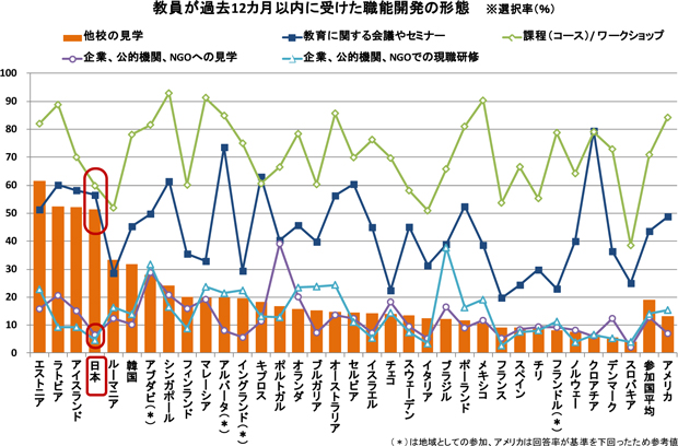 そうした取り組みを支えているのは、学校の教師であり、日本の教育水準の高さは日本の教師の水準の高さと言っても過言ではない。TALIS調査(注1)によれば、日本は伝統的に授業研究が盛んで、授業実践を見せ合い、授業後にディスカッションを行うことを通して指導力を高めている。また、日本は他の国と比べて「他校の見学」の選択率も高く、多くの他の実践から学ぼうとする教師の姿勢が伺える。(図)
