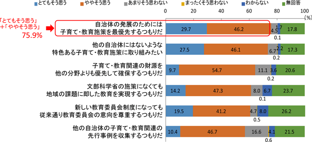 図1は、各自治体の子育て・教育施策についての考えをたずねたものである。「自治体の発展のためには、子育て・教育施策を最優先するつもりだ」と回答した自治体は、「とてもそう思う」「ややそう思う」を合わせると75.9%であった。これを回答者を首長に絞って見てみると、94.4%に達する。調査主体や調査名に起因する回答時の偏りを考慮する必要があるが、子育て・教育分野への取り組みが、自治体の発展につながるとの思いをもって、施策を実行する自治体が多いとみてよいだろう。本調査では、「自治体発展」の定義を明確にしていないが、人口規模の小さな自治体ほどこのような回答が多く見られる傾向があることから、少子化対策や定住人口増といった人口減少のための手当てと考える自治体が多いと推察する。