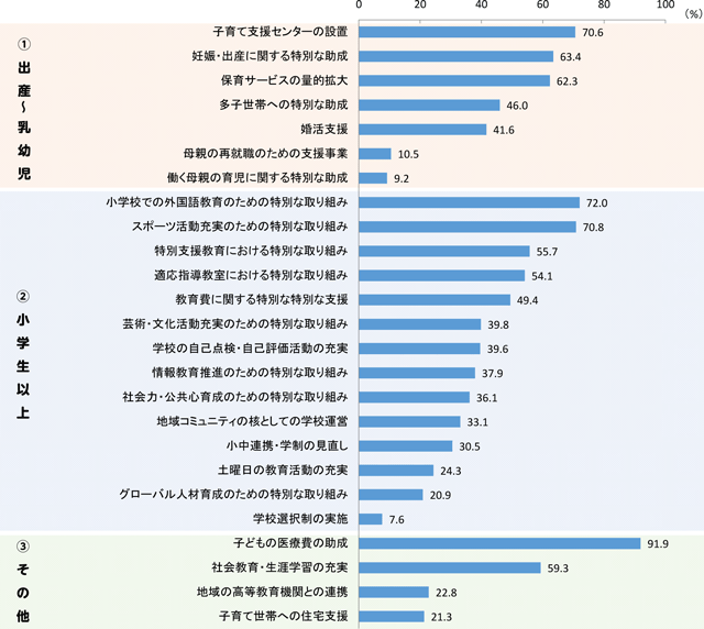 - 保育サービスの量的拡大(保育所の増設、一時預かり保育の機能強化など)62.3%