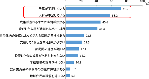 図3は、子育て・教育施策の実施上の課題をたずねたものである。もっとも多かったのは「予算が不足している」で71.9%、次いで、「人材が不足している」が58.2%であった。この2つの項目については、自治体の人口規模に関わらず、共通して挙げられていたのが特徴だ。一方、人口規模によって違いがみられたのは以下の項目であった。