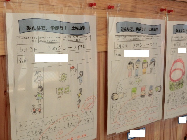 地元の人に協力してもらいながら収穫した梅を使ったジュース作りの発表。梅やゆずなど、土佐山の特産品の加工・販売を通して、自然がもたらす豊かな恵みに感謝する心を育てるねらい。地元の団体「土佐山夢づくりの会」や食生活改善推進員、保護者らの協力で行う(実施学年は1~6年生。写真は3年生の掲示物)。