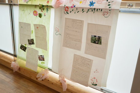 土佐山に自生する特産物「梅」や、県の絶滅危惧種にも指定されている「タキユリ」の調べ学習。全校児童・生徒が学年に応じて参加する「とさやま体験ツアー」の一つ。プログラムによっては、地域のNPO法人「土佐山アカデミー」が窓口となって海外の情報や環境問題の議論、ものづくりの出前授業、新たなフィールドワークにも繋げる(写真は5年生の掲示物)。