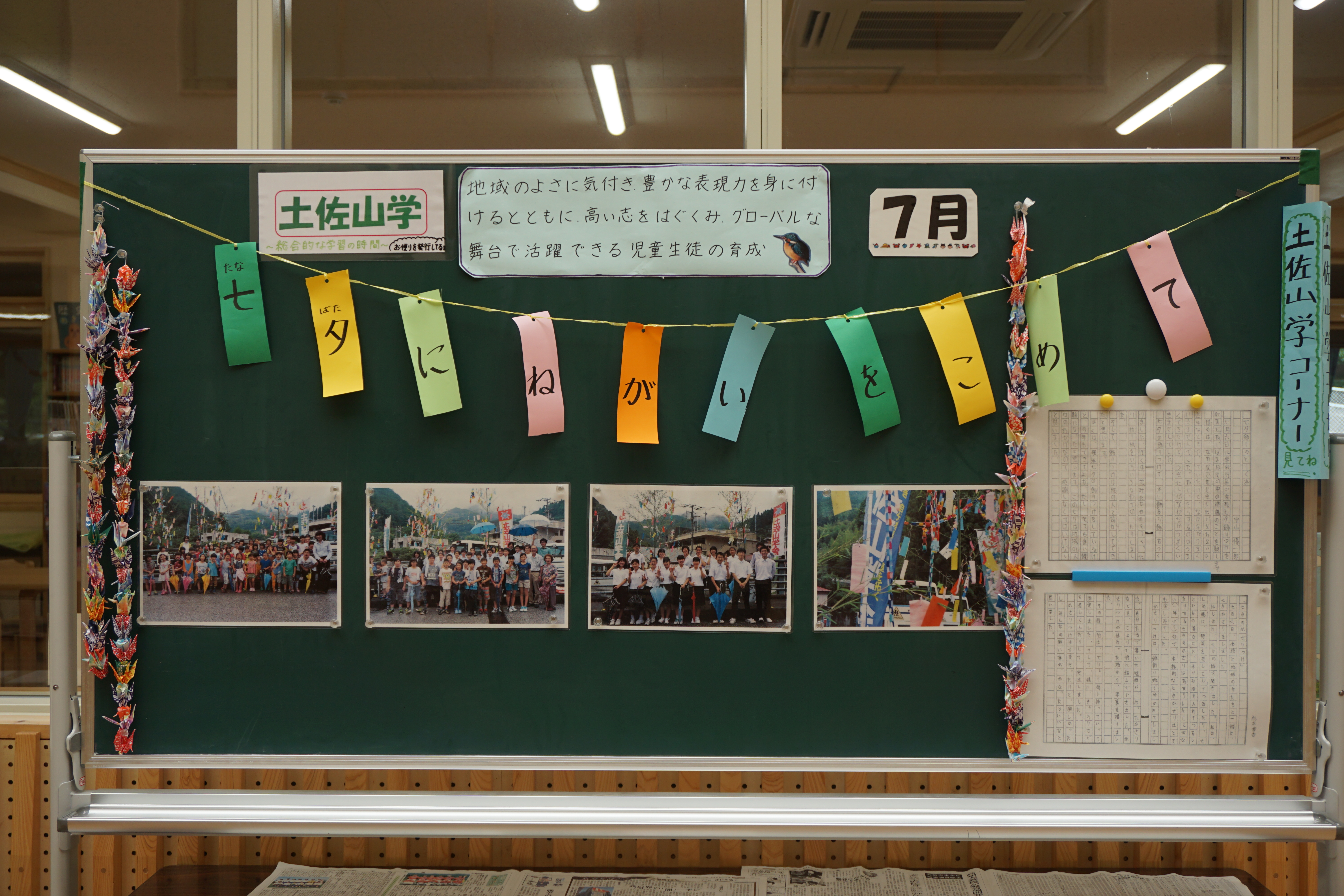 校舎の1F中央スペースにある土佐山学のコーナー。学習内容や季節に応じてさまざまな内容が掲示される