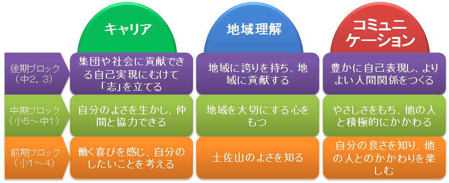 【図4 「土佐山学」の3本柱と学年区分ごとの目標】