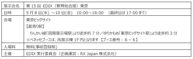 ベネッセグループは、2024 年 5 月 8 日(水)~10 日(金)の 3 日間にわたり、東京ビッグサイトで開催される「第 15 回 EDIX(教育総合展)東京」※に出展します。