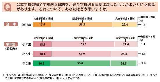 1990年代までの教育問題は、詰め込み教育で子どもたちが知識偏重になっており、生活体験、社会体験や自然体験などが不足していることにあった。家庭や地域で多様な体験をすることで、自ら学び、自ら考える力を養い、「生きる力」を育もう。学校週5日制はそうした理念の下に、1992年から月1回、1995年から月2回と段階的に行われ、2002年から完全実施された。(文部科学省「学校週5日制に関するこれまでの経緯」)。ところが、2000年代に入ると、子どもたちの学力低下が問題になり、完全学校週5日制による授業時数の削減と学習内容の減少が批判される。さらに、PISAなどの国際学力調査の順位の低下もあり、「基礎的な知識・技能の習得」だけでなく、「それらを活用する力の育成」も重視することが、文教政策の大きな方針になる。2010年代には、この方針に基づいて、新しい学習指導要領が全面実施(小学校2011年、中学校2012年)され、学習内容は大幅に増えた。その一方で、週5日制は基本的に変わっておらず、授業時数もそれほど増えていない。