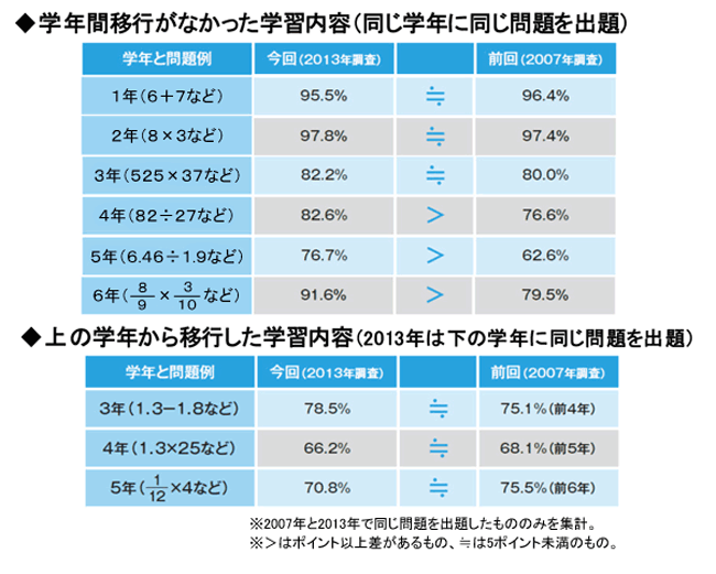 しかし、今回の計算力テストの結果(表1)をみると、学年間移行がなかった学習内容の正答率は、1~3年生では差がみられず、4~6年生では5ポイント以上上昇していた。また、上の学年から移行した学習内容について、下の学年で同じ問題を出題したところ、正答率に大きな変化はみられなかった。同じ難易度の問題を、下の学年の子どもたちが前回と同レベルで正答している。総合的にみて、子どもたちの計算力(計算技能)は高まったとみてよいだろう。