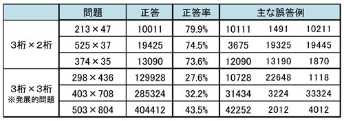 計算問題ごとに詳細をみると、例えば、3桁×2桁の計算問題の正答率は70%台なのに対して、桁数を1つ増やした3桁×3桁の発展的問題は正答率が20~40%台に下がる。原理は同じでも、計算が複雑になるだけで正答率は大きく落ちる。